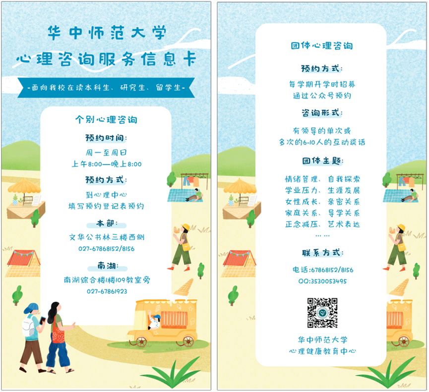 1)团体信息:请每学期初多多关注我校大学生心理健康教育中心的公众号平台:华中师范大学心理中心