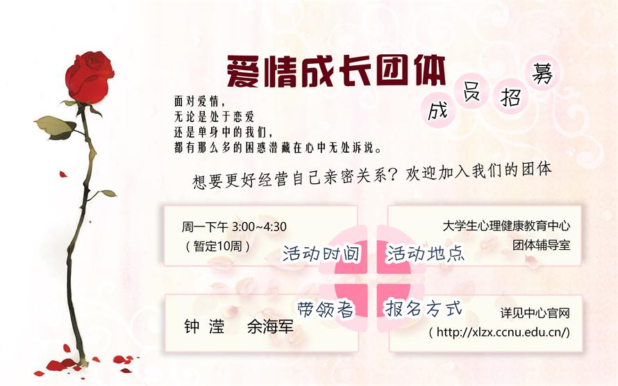 如果你愿意真诚地与大家进行沟通与分享,愿意对自己和他人进行深入的了解和探索,且本学期每周一下午3:00—4:30都有时间,那么我们诚挚的邀请你加入我们的“爱情成长团体”,在两位专业心理老师的带领下,互相支持、共同成长,更好地经营自己的亲密关系!
