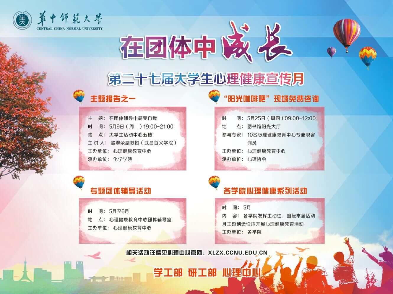 为进一步加强和改进我校大学生心理健康教育工作,在学生中普及心理健康知识,树立心理健康意识,提高大学生的心理健康水平。经研究,学校定于5月举行第二十七届大学生心理健康宣传月活动。现将具体事项通知如下: