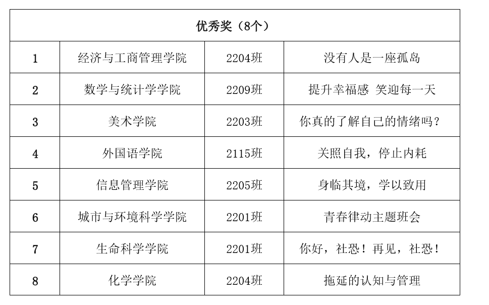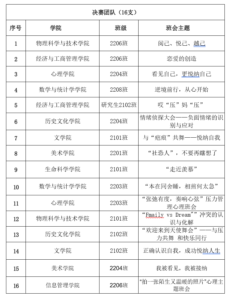 为切实做好心理育人工作,发挥朋辈力量在心理育人中的作用,培养自主、 自助维护心理健康的意识和能力,提高大学生心理健康水平,“以班之名,逐梦 同行”华中师范大学第三届主题心理班会策划大赛于2023年4月24日启动,经各学院推荐,主办方组织专家、评委老师对选送的书面及视频材料进行评审,最终评选出决赛团队16支,现将决赛入围结果予以公示: