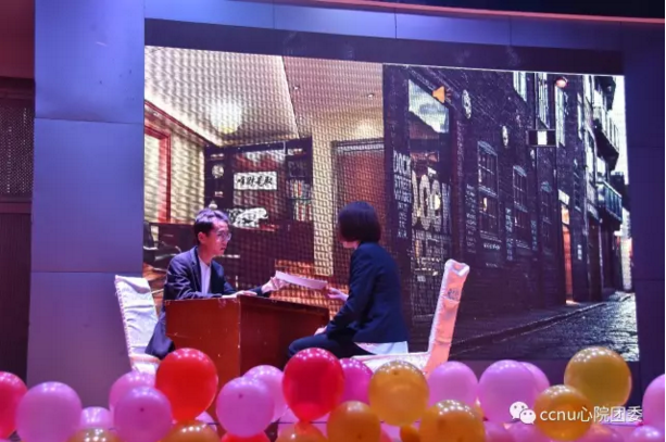 在主持人一番简单的暖场后,本次比赛便正式开始了。首先登场的是“五魁首六六六”队,他们的主题是“大学生应不应该谈恋爱”。他们以穿越为题材,通过主人公三次穿越的三次不同的经历,从辩证的角度对主题进行了探讨,获得了现场观众的一片叫好声。接着,“演技颜值双全”队、“心理剧老粉脸”队这两个队伍分别以“人性本善还是人性本恶”、“重生为男生还是女生更好”为主题给大家带来了精彩的表演。在前三支队伍表演结束后,主持人举行了现场抽奖环节,从登上了微信墙的观众里抽取两位送出了三等奖和二等奖,抽奖活动也将现场气氛推向了一个小高潮。