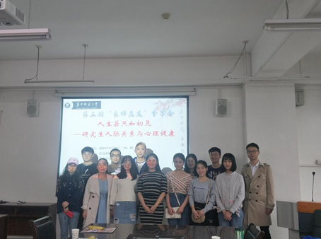 (华大教育学院讯通讯员:杜安琪 摄影:滕洋)2019年4月26日下午15:00,华中师范大学第三期“良师益友”分享会之“人生若只如初见——研究生人际关系与心理健康”活动在教育学院415教室举行。本次活动由华中师范大学研究生会主办,华中师范大学教育学院研究生会承办。本次活动由心理健康教育咨询中心的王巍欣老师担任主讲,教育学院学术部雷宇轩同学主持。来自我校多个院系的十几位研究生参加了此次活动。