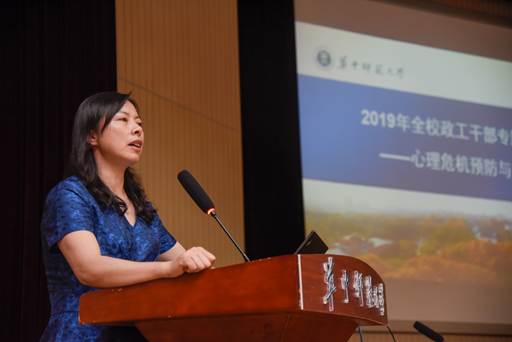 为进一步推进《高等学校学生心理健康教育指导纲要》落地落实,提升高校心理育人工作质量。我校在“5·25大学生心理健康教育月”期间于5月22日下午举办了全校政工干部心理危机预防与干预专题培训,本次培训由本科生院(党委学生工作部(人武部))、研究生院(党委研究生工作部)主办,华中师范大学心理健康教育中心承办。校党委副书记覃红、党委学生工作部(人武部)部长韩君华、研究生工作部部长杨军、党委学生工作部(人武部)副部长吴建成、部分学院领导、各学院辅导员及心理中心部分专职教师共160余人参加此次培训。培训由韩君华部长主持。