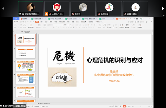 为进一步做好我校学生心理健康教育工作,提升工作的针对性和有效性,我校于5月16日晚顺利举办了全校政工干部“心理危机学生的识别与应对”网络在线专题培训,本次培训由本科生院(党委学生工作部(人武部))、研究生院(党委研究生工作部)主办,华中师范大学心理健康教育中心承办。副校长彭双阶、党委学生工作部(人武部)部长韩君华、研究生工作部部长杨军、党委学生工作部(人武部)副部长吴建成、研究生工作部副部长黎俊玲、部分学院领导、各学院辅导员、心理中心部分专职教师共190余人参加此次培训。培训由韩君华部长主持。
