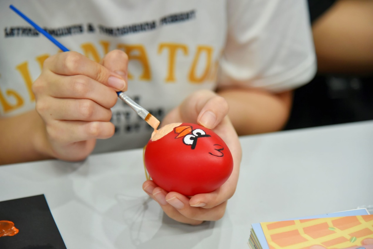 第一环节是在仿真鸭蛋上创意作画活动。同学们将仿真鸭蛋当做画布,在上面尽情地抒发自己的想象力,通过画笔将多彩的颜料勾勒成一幅幅极具特色的画作。在绘画中,同学们浮躁的心灵也得以放松,所有的烦恼烟消云散,将全身心投入到眼前的画作。在同学们的巧手下,诞生出众多惟妙惟肖的作品,令人赞不绝口。